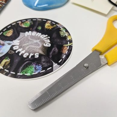 Aside from the pouch and ceramic mushroom already shown above, each kit includes a pair of scissors with ruler along the edge, one skein of embroidery floss, a needle secured in an upcycled envelope, a QR code to my instructional video, plus as an added bonus...a handmade sticker, designed by me!